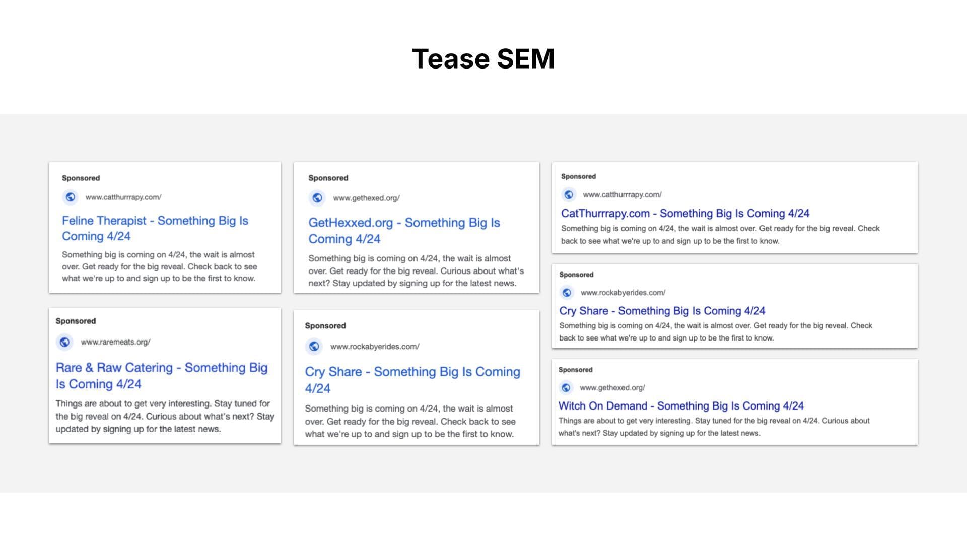 The Tease: Known amplified an ‘In Plain Sight’ tease campaign to drive curiosity and intrigue about what Slate is doing prior to the launch by driving traffic to fake business landing pages and “hacked SNL by inserting a "Taxider-my-family” fake commercial immediately after Timothee Chalamet’s opener, right where SNL’s fake commercials normally sit. Attention was extremely high and we had people asking, “wait, was that a sketch?”